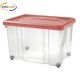 Contenitore in plastica trasparente con coperchio color corallo e 4 ruote.